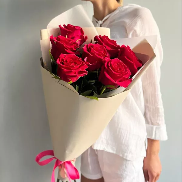 Букет из 7 красных роз в стильной упаковке